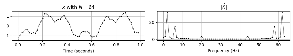 \(\textbf{Example}\) Let us create an example signal \(x1\) of length \(N=64\) and duration 1 second that consists of three sine waves of different frequencies (\(1.9, 6.1, 20\)) and phases.